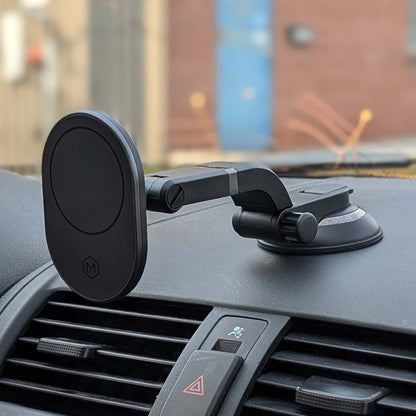 Choose a clean, flat surface, press the suction cup down firmly, lock the lever, then attach your phone to the MagSafe head for instant magnetic hold.